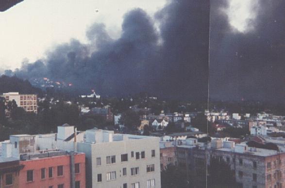 On Sunday, October 20, 1991, a firestorm swept through the Oakland/Berkeley hills area. Fed by hot, dry, gusting winds from the central valley, the flames spread rapidly out of control. The firestorm engulfed 1500 acres, destroyed over 2800 houses, and killed 25 people.
