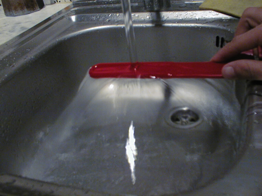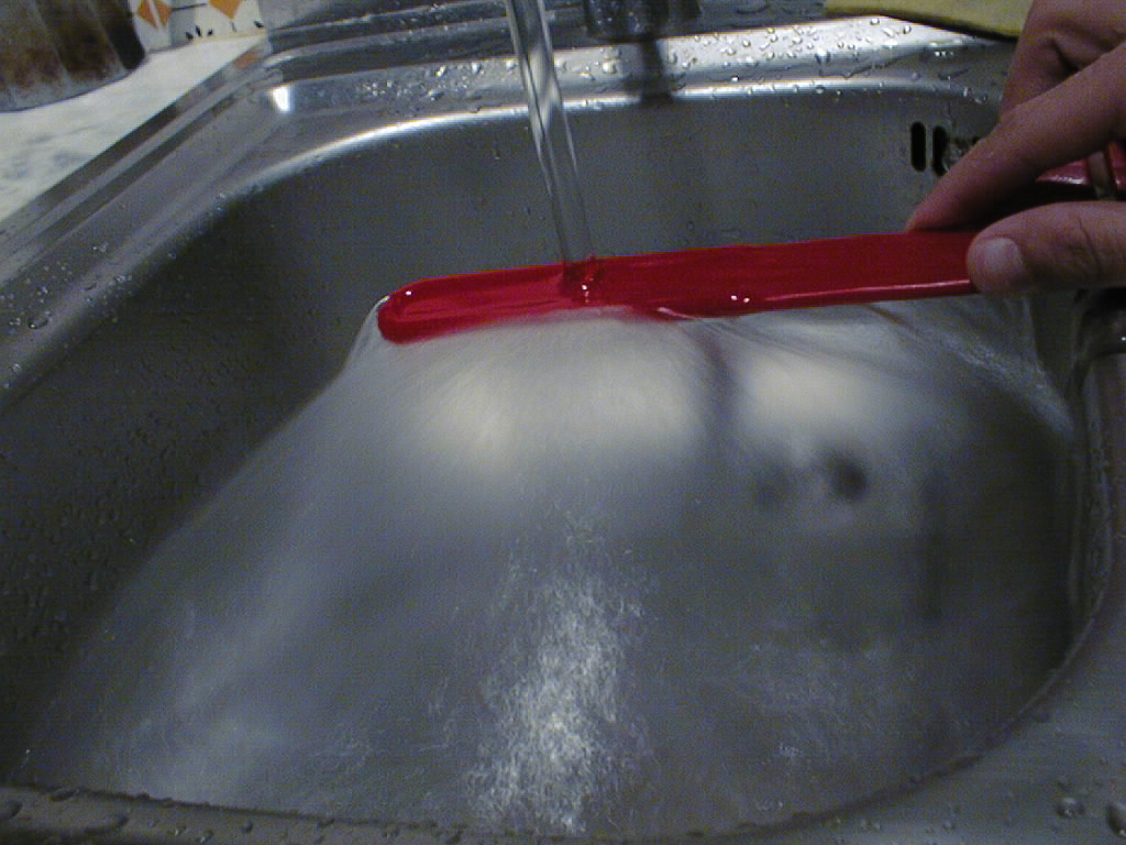 Turning the spoon right-side-up causes the water to