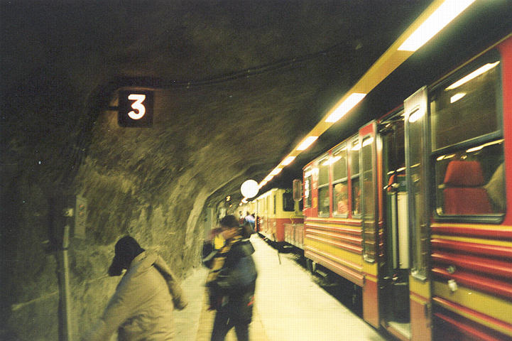 ++ Another attraction at the Jungfraujoch station is the Ice Palace, carved straight into the glacier. The floor, walls, and ceiling are all bare ice. The glacier keeps the air below freezing year-round. |