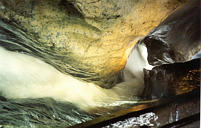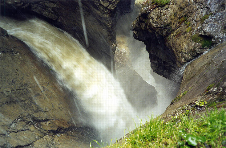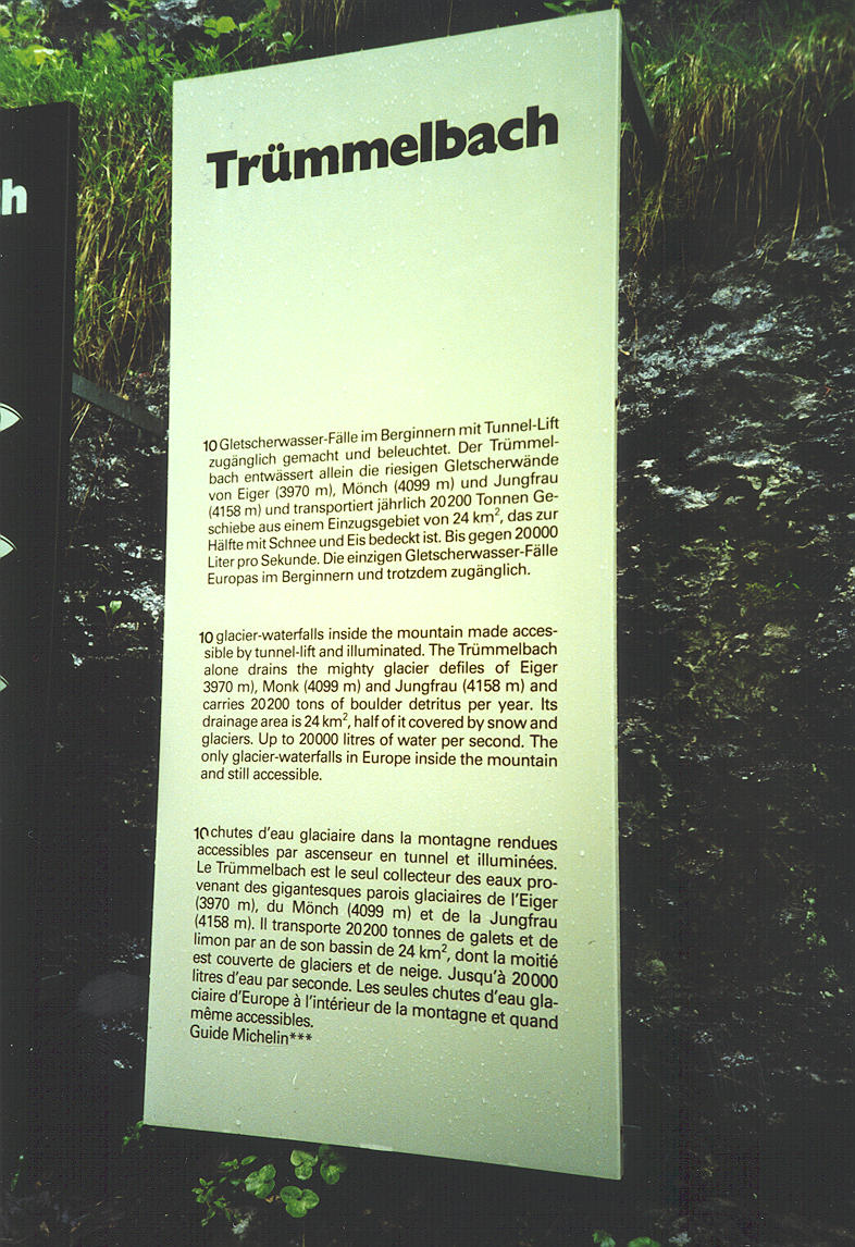Trummelbach. 10 glacier-waterfalls inside the mountain made accessible by tunnel-lift and illuminated. The Trummelbach alone drains the mighty glacier defiles of Eiger (3970 m), Monk (4099 m) and Jungfrau (4158 m) and carries 20.200 tons of boulder detritus per year. Its drainage area is 24 km2, half of it covered by snow and glaciers. Up to 20.000 litres of water per second. The only glacier-waterfalls in Europe inside the mountain and still accessible.