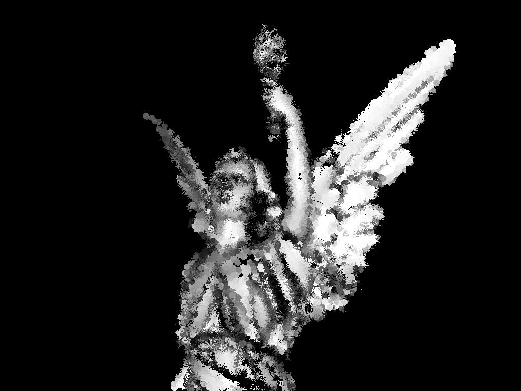 Fun Modifications In order to give our version of The Impressionist some added flexibility, we equipped it with a set of colors, roughly corresponding to the rainbow scale of ROYGBIV, which the user may select in lieu of the basic impressionistic option. By selecting one of these colors, the user is able to "paint" the image, and thus the statue, in whatever style they please. In order to switch between the coloring option and the standard CS248 impressionistic style, the user must select the "Toggle Paintbrush" option from the menubar. Lastly, the user may select between two different algorithms for coloring the statue. In particular, this "Toggle Shading" option allows the user to enable a coloring system in which the RGB value of the chosen color is scaled by the shade of the pixel underneath. Thus, if a red paint (1, 0, 0) were being applied to a pixel at a location where the original image was a gray shade of (0.5, 0.5, 0.5), the resulting RGB value outputted to the screen would correspond to (1, 0, 0) * (0.5, 0.5, 0.5) = (0.5, 0, 0). It is important to note that this system assumes that the original image is of a greyscale format.