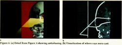 Figure 4. (a) Detail from Figure 3 showing antialiasing. (b) Visualization of where rays were cast.