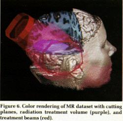 Figure 6. Color rendering of MR dataset with cutting planes, radiation treatment volume (purple), and treatment beams (red).
