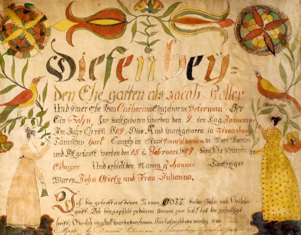 The artist was Daniel Peterman (the note at the very bottom seems to say, "Made by Daniel Peterman, Shrewsbury Township, York County"). The work is watercolor and ink, 12.5 by 16 inches. It was sold as Lot 437 ($7,475) in an auction at Pook & Pook on October 8, 2004. There was a special session of Frakturs sold that day from the collection of Fraktur scholar Dr. Donald Shelley, so maybe it was one of his?