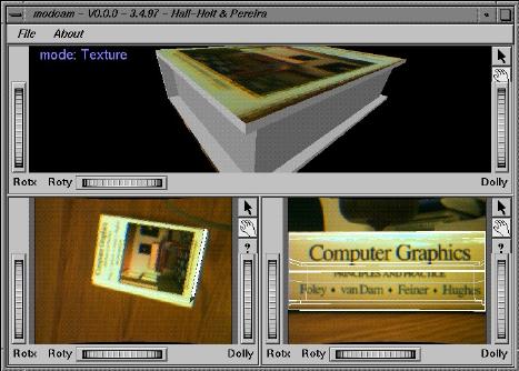 Modcam has a simple user interface based on the examiner viewer in the SGI's Open Inventor package. As you can see in the above (middle) snapshot, there are three windows. The top window is used for interacting exclusively with the developing model, while the lower two windows allow interaction with pictures and/or the model. Each window has an associated set of standard widgets, which allow for rotation, translation, zoom, and other operations.