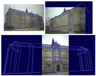 In order to recover the camera position and more accurately estimate the proportions of our modelled shapes, we followed the work of Debevec et. al. to create a non-linear local optimizer. For the moment, our implementation focuses on simple boxes. Given sufficient edge correspondences in the image, we calculate the positions of the projections of four or more corners of the box in the picture. We then define our cost function to be the sum of the squared distances to corresponding points in our box model when projected using the current camera and object parameters. Using a standard conjugate gradient method (Newton-Raphson and Fletcher-Reeves) we quickly obtained our desired transform matrices. We hope to extend this to handle more complex domains, and at least allow the positioning of edges relative to the current best guess for the camera position.