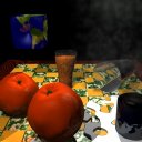 These models are good, and the raytracing effects are often dramatic. But how much time did the students spend to model these objects? The oranges were volume-rendered with a volume density function. The rest of these objects were modeled by hand. Presumably, the students spent some time trying to get the shape and proportions right.