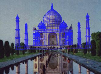 These pictures show a single source image of the Taj Mahal, and the 3D model generated by Debevec's program, facade. Basic geometric primitives (i.e. "blocks") are good for modeling many of the features found in architecture, such as flat walls and objects of revolution. They often have identifiable edges that enable easy correspondences between the picture and the model. Currently, facade is able to handle polygonal walls, surfaces of revolution, and archways.