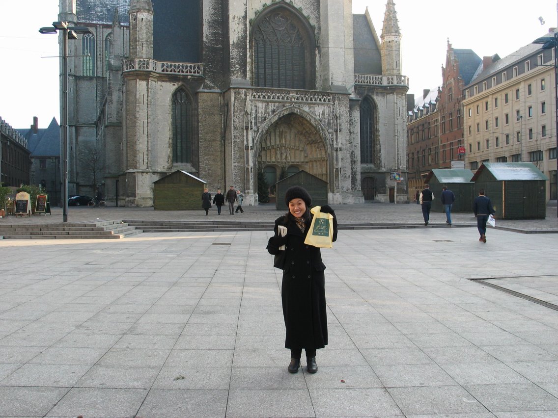 Christine triumphantly displays her prize, a 250-gram (1/2 pound) box of Neuhaus pralines. The Sint-Baafskathedraal (St. Bavo's Cathedral) is in the background.