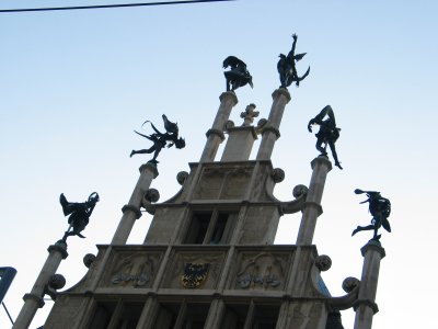 Amusing "gargoyles" atop a city building. At first sight, Toli thought they were balancing on one leg or an arm, and was impressed that they could be so stable; upon closer examination, it looks like an extra rod connects the body of each figure to the stand. Poopycakes!