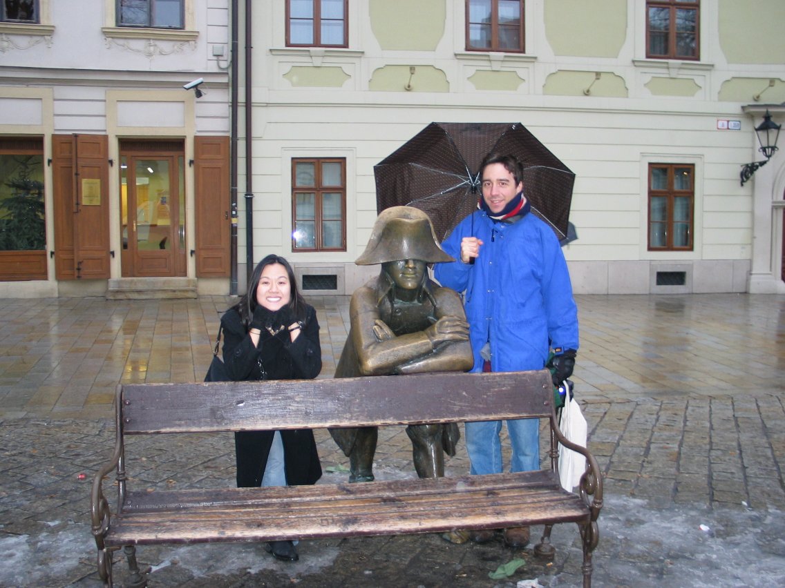 Christine and Toli with the statue of a Napoleonic soldier.