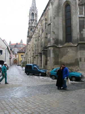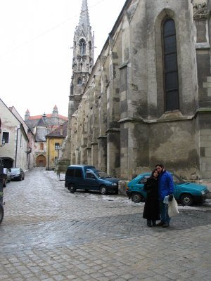 Christine and Toli in front of the kostol Klarisiek. The