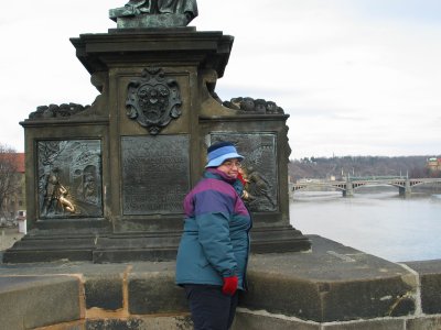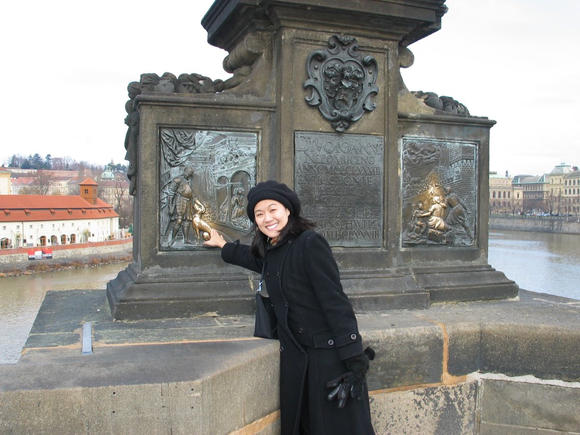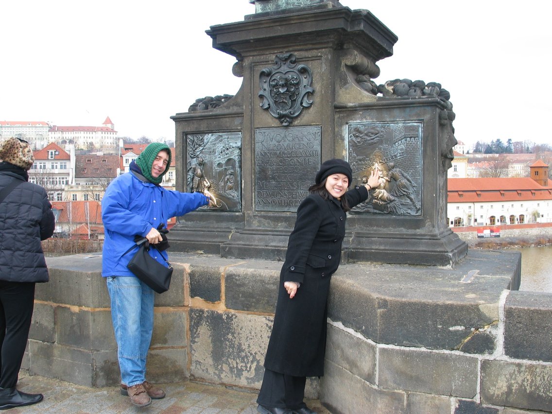 Myrto touches the falling saint at the statue of St. John Nepomuk