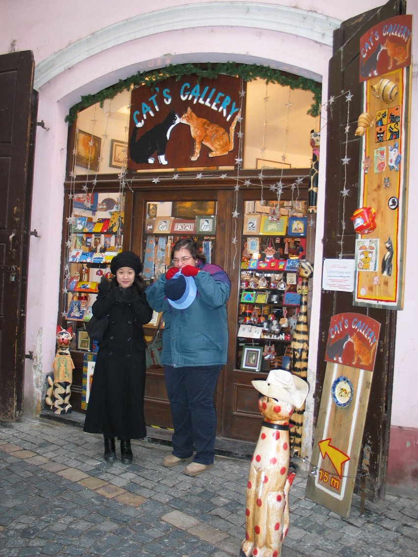 Christine and Myrto pose in front of a feline-themed store. Cats