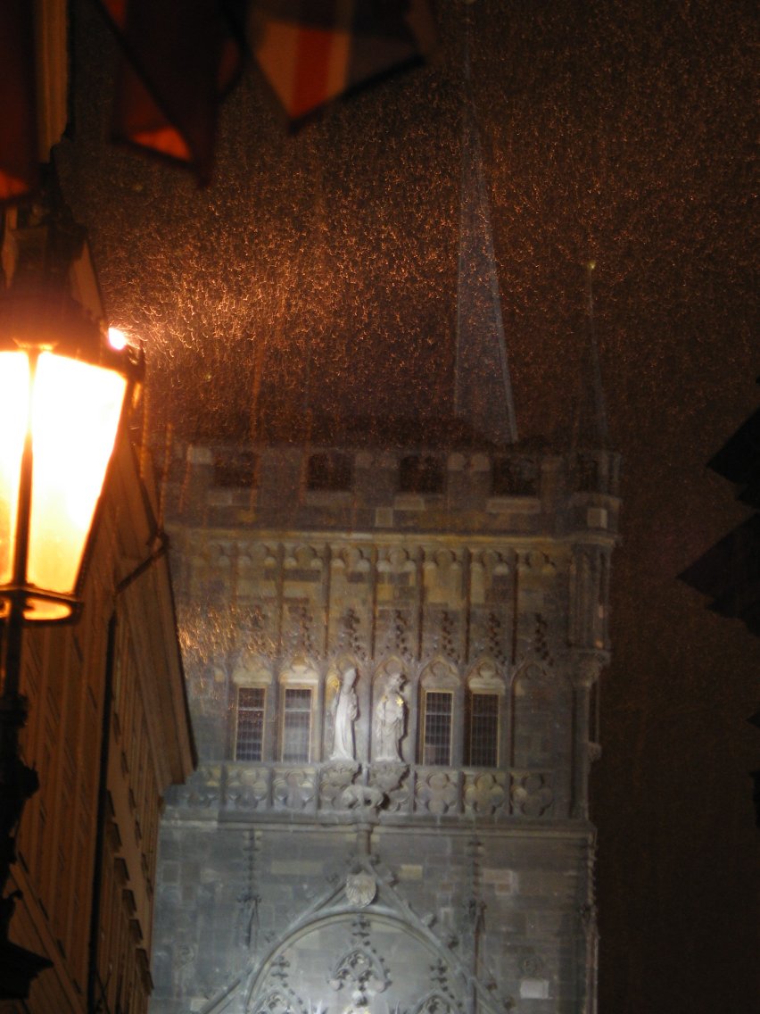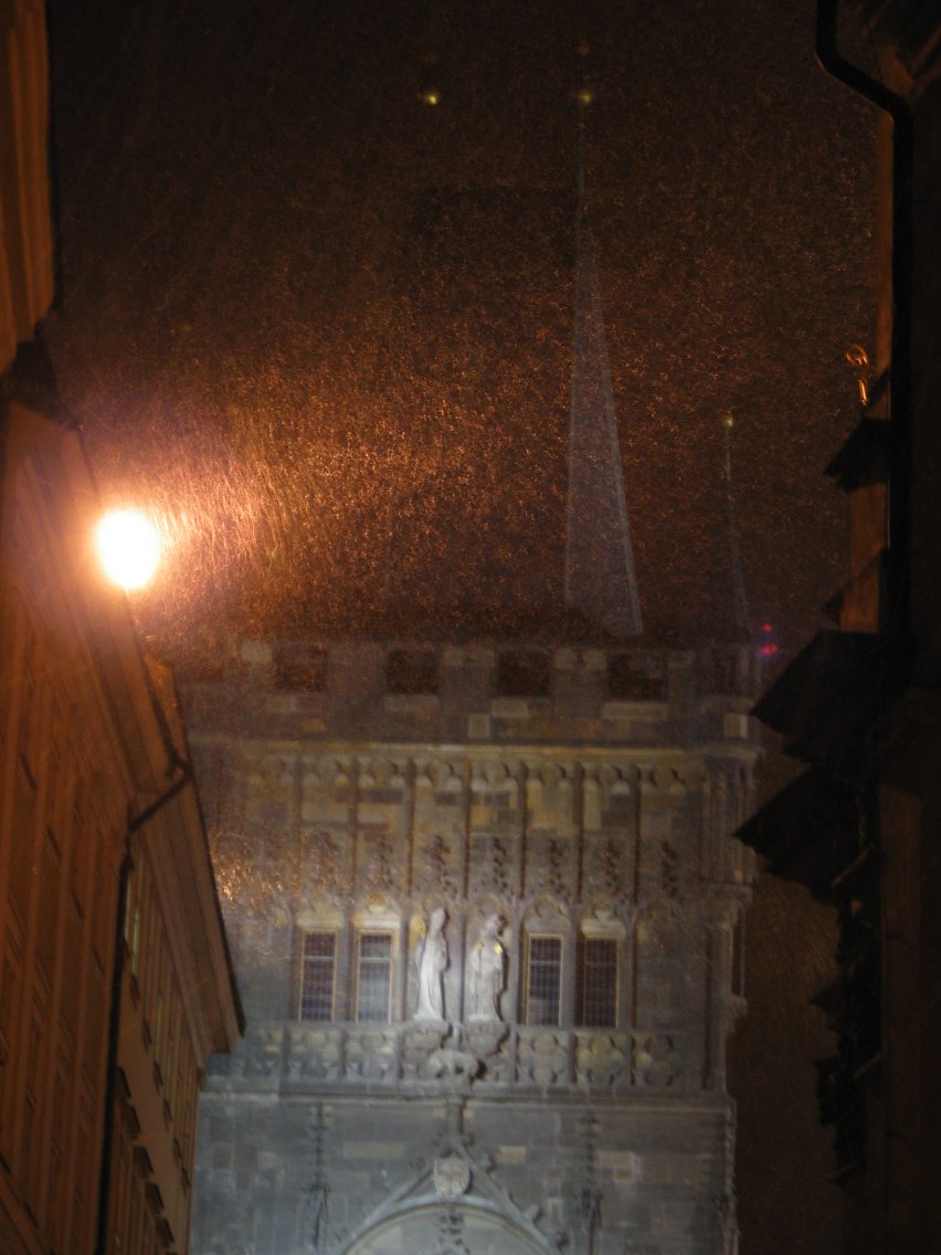 The Karlův most tower as the snow starts falling.