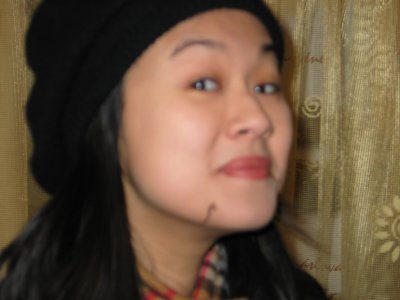 Christine downs a chocolate pastry, getting most of it on her face.