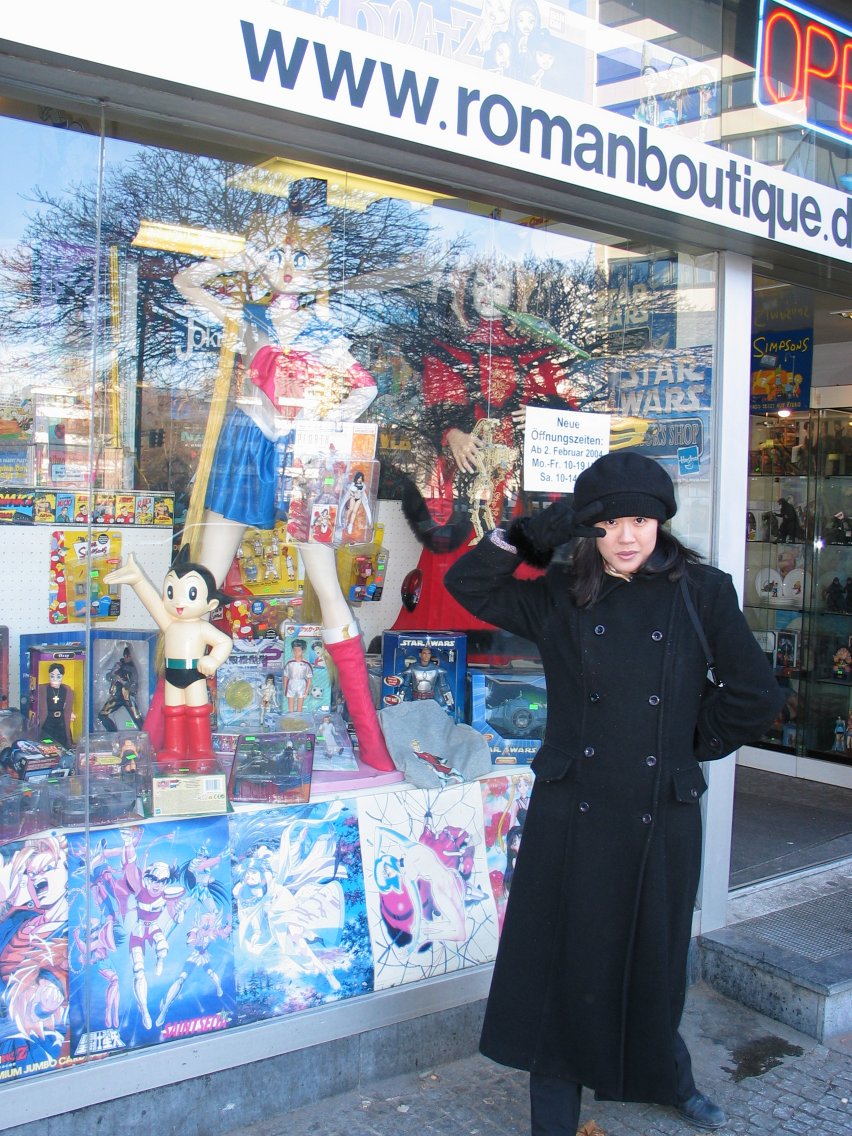 Christine does her Sailor Moon impression in front of Roman-Boutique,