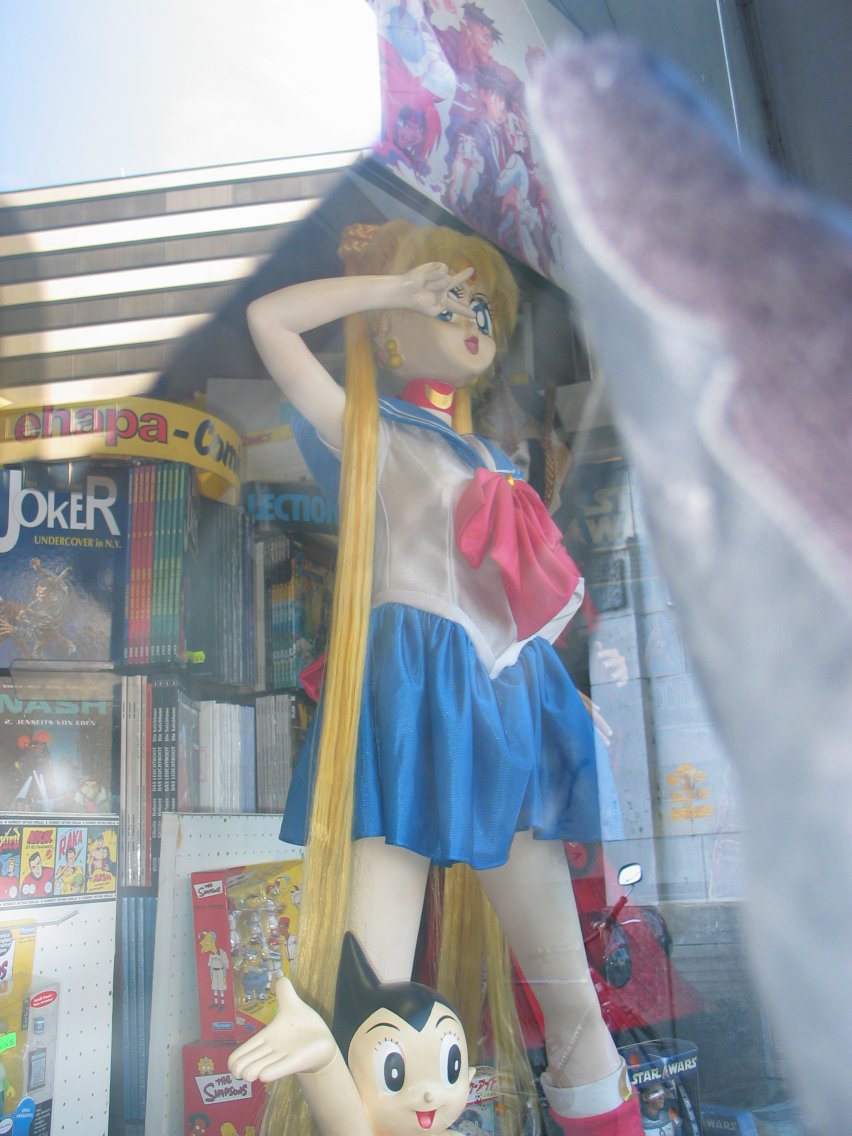 Sailor Moon in the store window. A rare instance where Toli actually