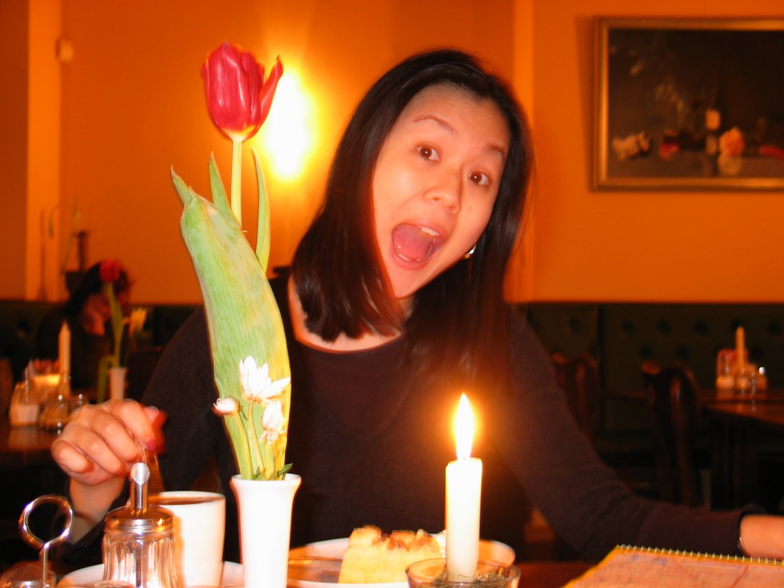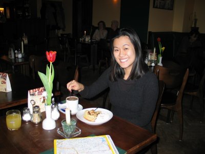 Christine enjoys one last coffee and dessert at a cafe.