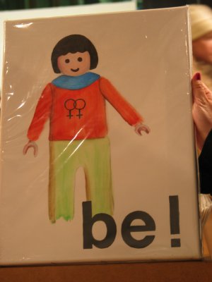A painting of a lesbian Playmobil figurine.
