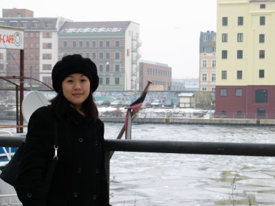 Christine on the bank of the Spree river, with a section of the Berlin